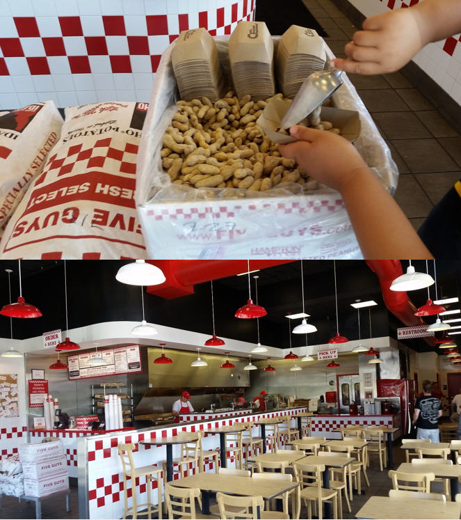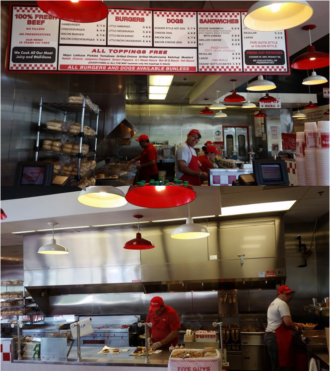 FIVE GUYS BURGER는 미국 워싱턴 DC 에서 시작한 햄버거집으로, 수제버거, 감자튀김, 밀크쉐이크가 무척 유명한 집입니다.